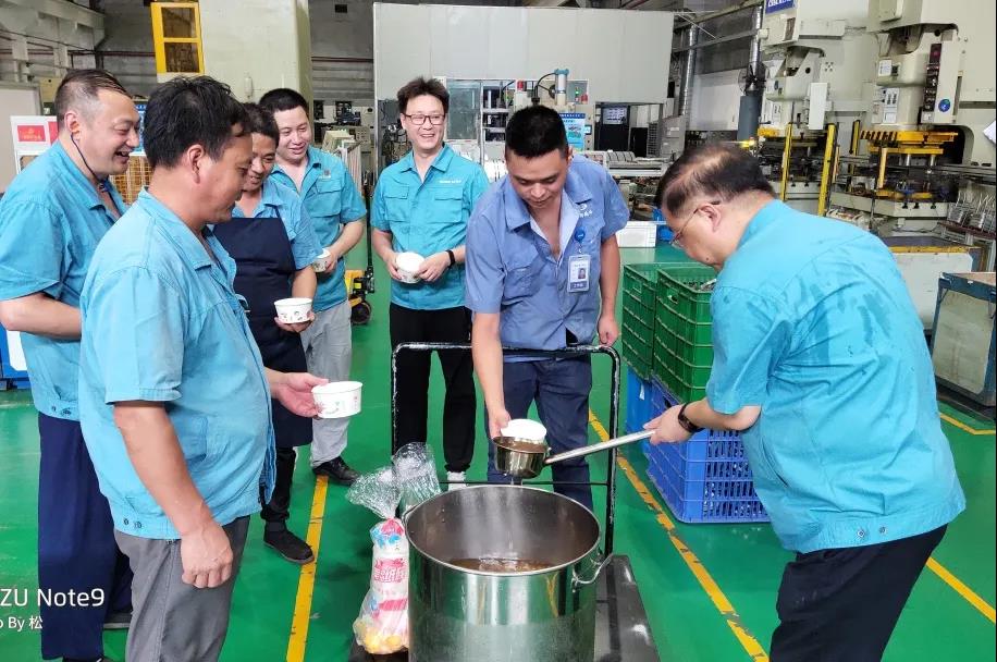 公司工會(huì)主席,監(jiān)事會(huì)主席譚萬(wàn)江帶隊(duì)到車(chē)間生產(chǎn)一線,將一碗碗冰爽的綠豆湯送到職工手中,為他們帶去夏日的一絲清涼。